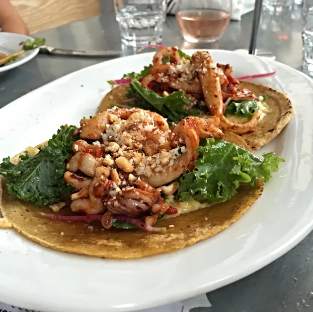 A salad of baby lettuces with carrot, sunflower seeds, grapefruit, coconut, and cumin vinaigrette is refreshing. Pair that with the Spicy Squid Tacos, which come with kale, apple, cotija, and corn nuts. They are great.