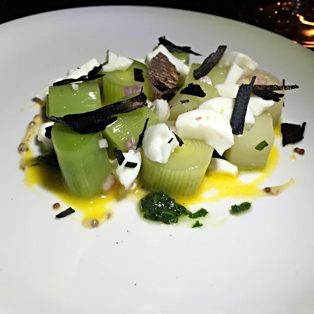 Leek vinaigrette comes with soft boiled egg, dijon, and leek ash. It's leek on fleek, and wonderful.