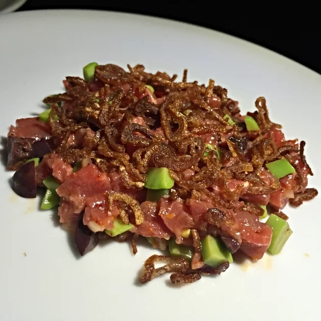 Lamb tartare comes with olive, fava bean, creme fraiche, and espelette. It's glorious.